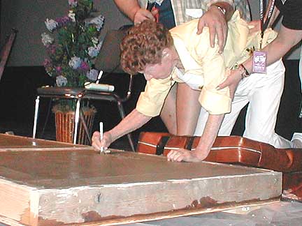 And of course here, Irma Kusely is signing her just made hand prints in cement.