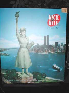 Lot #20- NICK AT NITE'S STATUE OF LIBERTY-LUCY: This scarce wall hanging features Lucy Ricardo as the Statue of Liberty. Created as a special Nick-At-Nite promotional item, this was never sold to the general public. Of special note: The Twin Towers appear in the background. Opening bid was $200. It sold for $350. |
