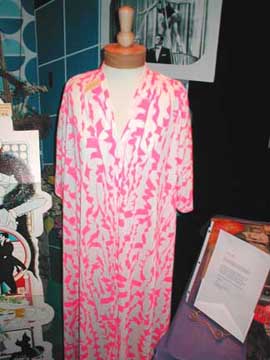 Lot #72- LUCILLE BALL'S HOUSE DRESS: Lucy purchased this long, casual dress with zipper front from Bergdorf Goodman. (Trivia: Did you know Bergdorf Goodman was also the store where Lucy purchased her trousseau when she married Gary Morton?) Hot pink print on white. This very special item is made available courtesy of Lucy's longtime secretary, Wanda Clark and includes a letter of authenticity from Ms. Clark. Opening bid: $100. Sold for $675. |