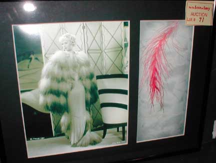 This framed image of Lucille Ball dates back to 1935 and was taken on the set of the RKO film, Roberta. The gown Lucy wears in this picture was recently located; however, it was in a state of disrepair. In an attempt to salvage what was possible, feathers from the gown were cared for. One feather from this gown is framed here. A signed certificate of Authenticity is included on the back of the frame. Opening bid: $200. Sold for $220. |