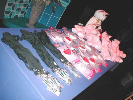 This is the table with all the prizes for the I LOVE LUCY TRIVIA CONTEST laid out on it. The black things on the left are lanyards that were given to each contestant as they were called to play the game. The heart-shaped purses were the consolation prizes given out to the losers of each round. The medium-sized pink bears were given to the one winner of each round. The largest bear went to the grand-prize winner (which was Mike Broad of Windsor, Ontario). Who's that? Just lucky, I guess!! |