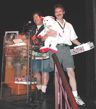 Here's the grand-prize winner with his bear and another prize from TV Land - a box of some sort with picture openings on the lid. Oh, and it was red velvet-lined. He also got a book called, TV Land To Go: The Big Book Of TV Lists, TV Lore, And TV Bests. (I want the box!!!!) |