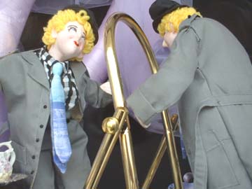 Pic 054 Saturday morning on our way to the first event, we took pictures of the windows at the Community Bank building. There were these real cute sculptures. My pics were up close, then Mike took one of the whole window, reflections and all. This is Lucy and Harpo. |