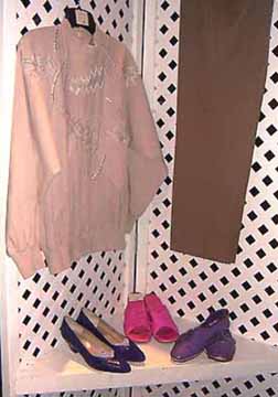 Beige Cotton Top ($405), Tan Slacks ($305), Saks Fifth Ave Wedge Shoes ('purple' $400), Moon Shadow Shoes ('pink' $385), Other Shoes (?).