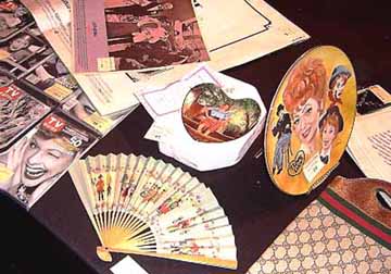 50th Anniversary TV Guides (2x $10, 3x $15, 3x $20), MAME Movie Poster ($50), MAME Mexican Lobby card ($45), Heart-Shaped 'Soaking Up Local Color' Plate ($90), Lucy's Paper Fan ($325), Lucy Tribute Plate 'yellow' ($700), Lucy's Gucci Tote Bag ($475).